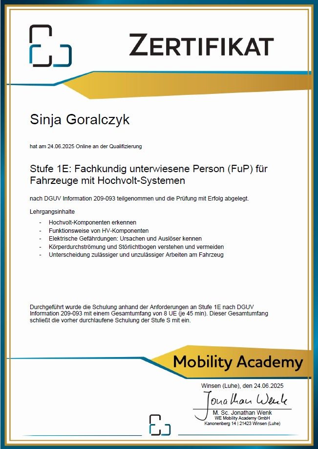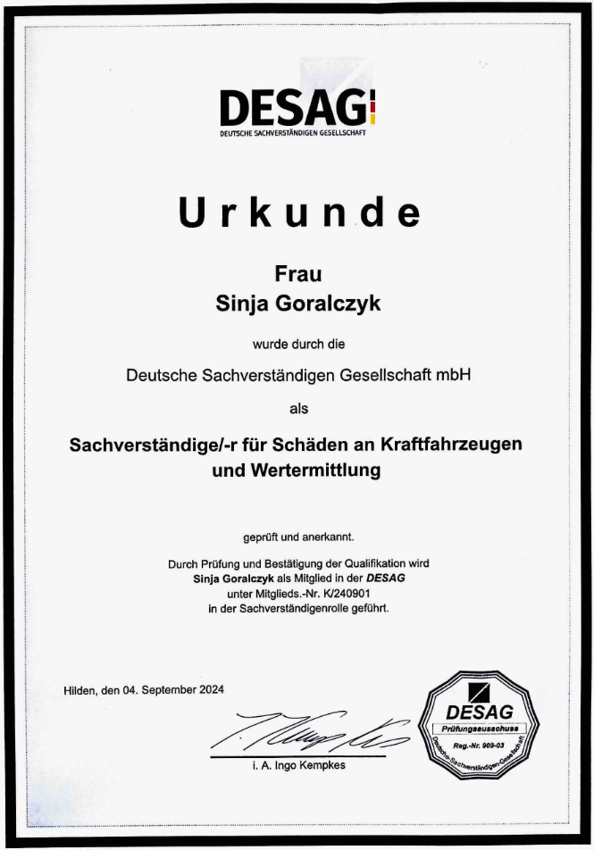 Als geprüfte, anerkannte Kfz-Sachverständige (DESAG) und gelernte Kfz-Mechatronikerin bringe ich umfassendes Fachwissen und Expertise in meine Dienstleistungen ein.